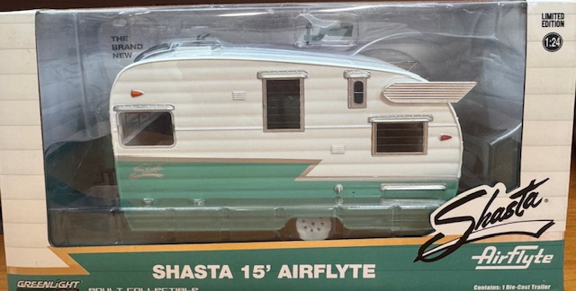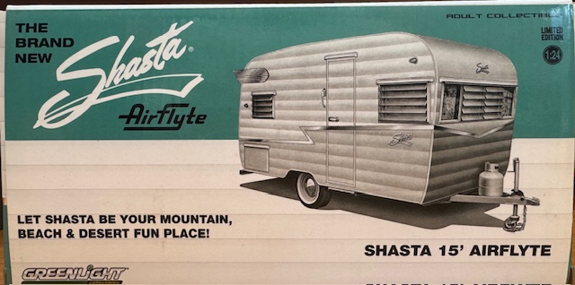 SHASTA 15′ AIRFLYTE HOLIDAY TRAILER IN 1:24 SCALE (APPROX 7 INCHES LONG) MADE BY GREENLIGHT
