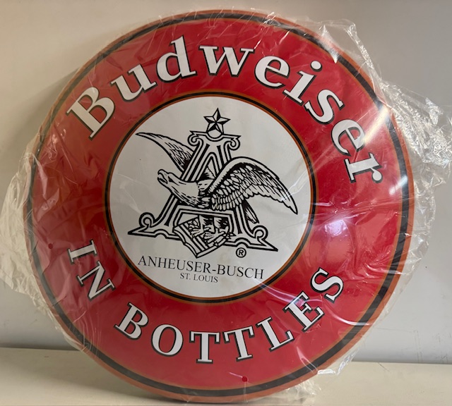 BUDWEISER IN BOTTLES – DOMED LIGHT WEIGHT METAL SIGN (16 INCHES)