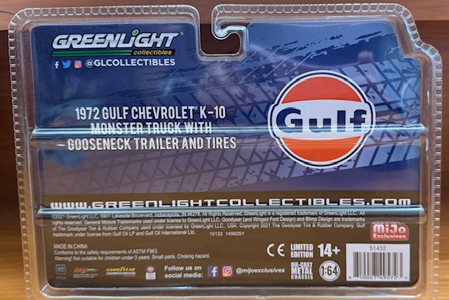 1972 CHEVROLET K10 MONSTER TRUCK WITH GOOSENECK TRAILER AND TIRES – #22 – GULF GRAPHICS (MIJO EXCLUSIVE)